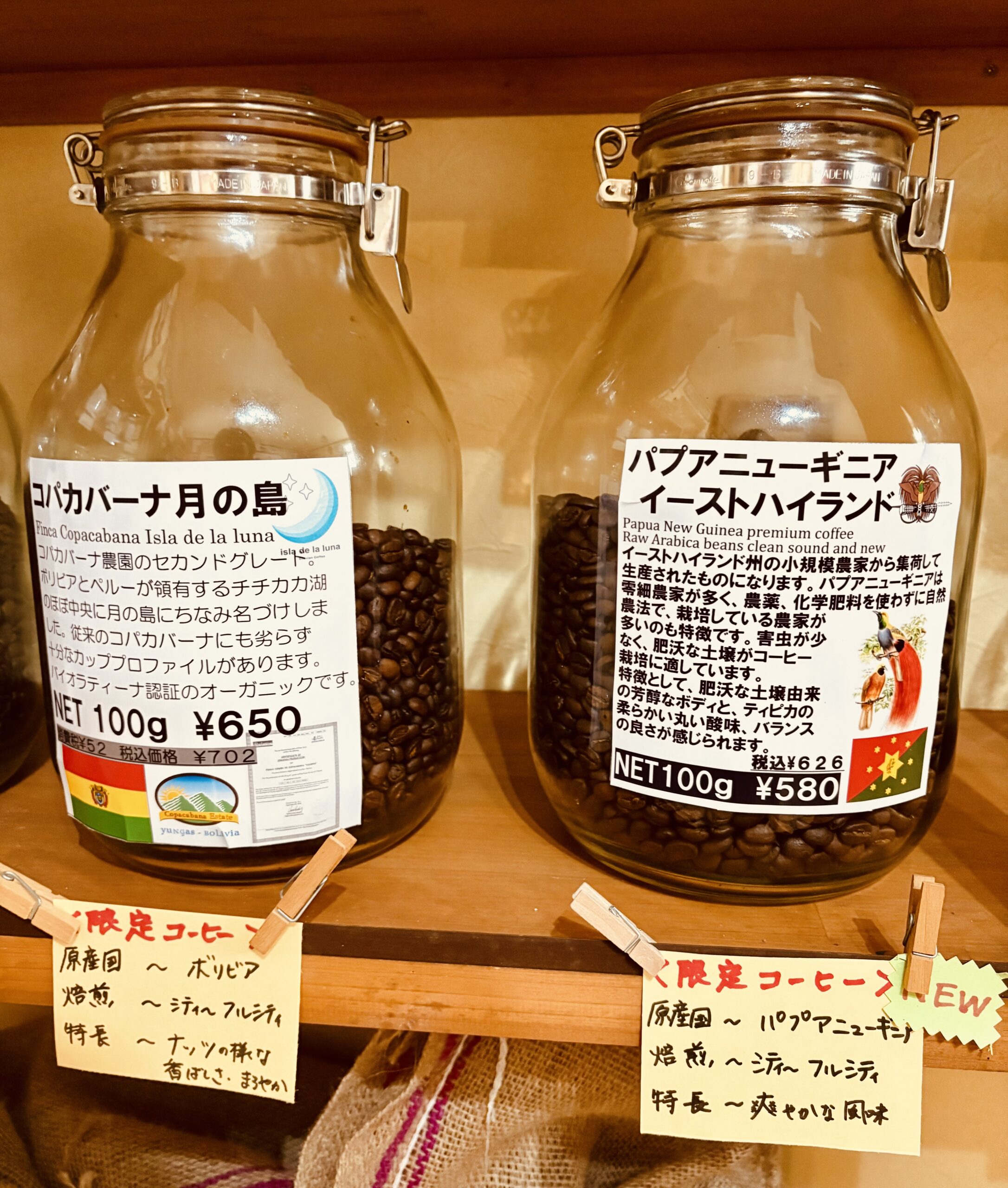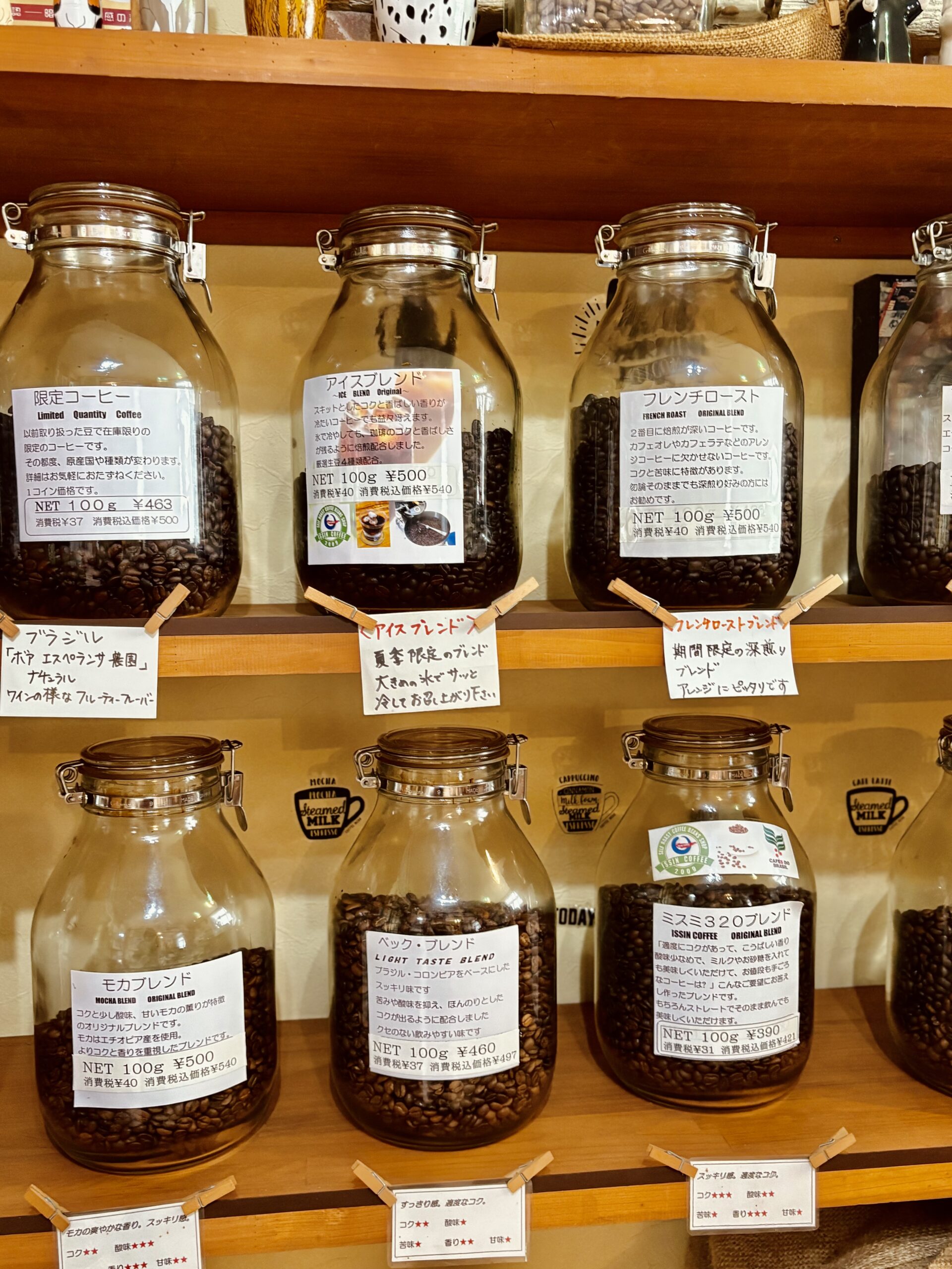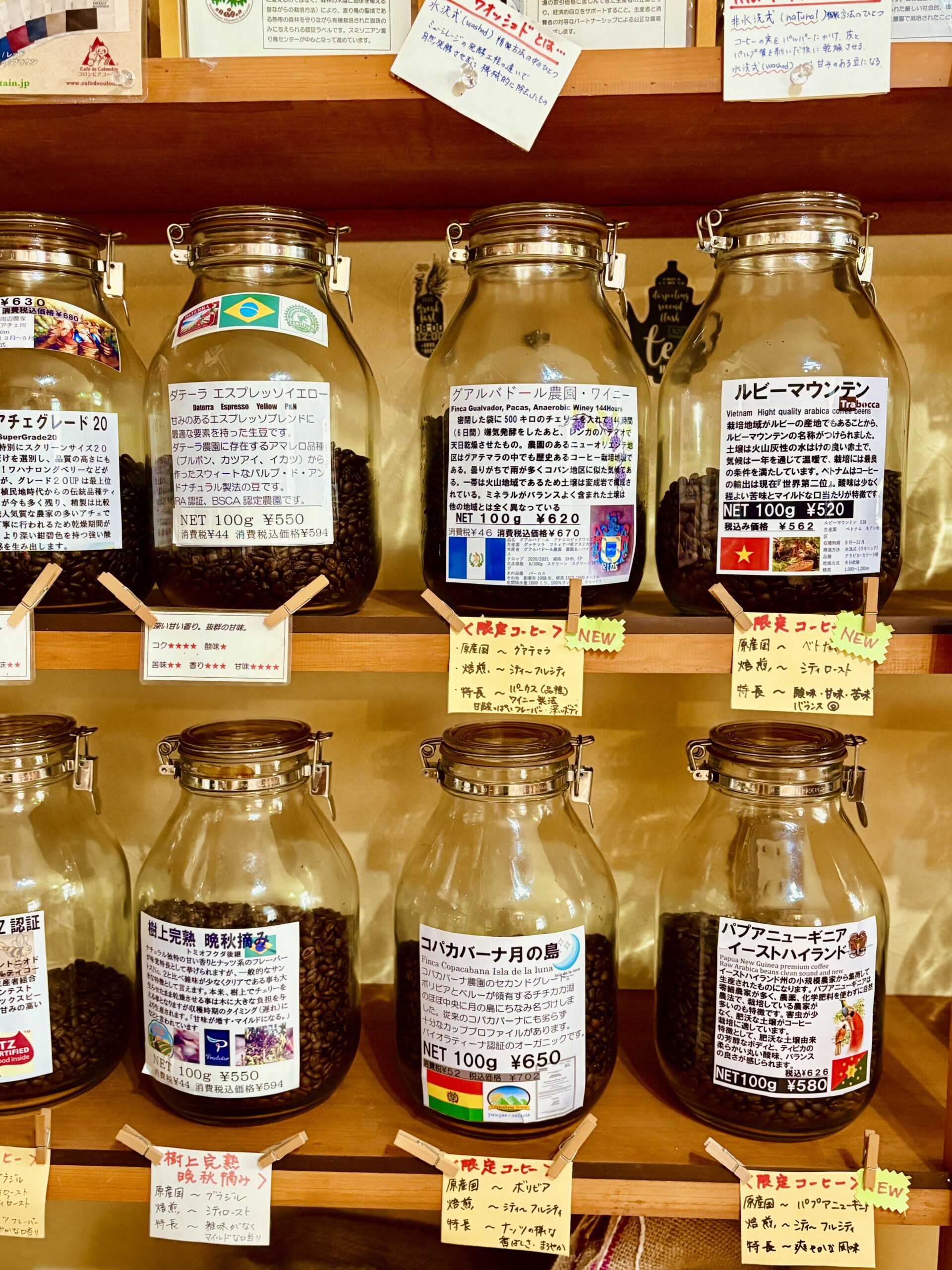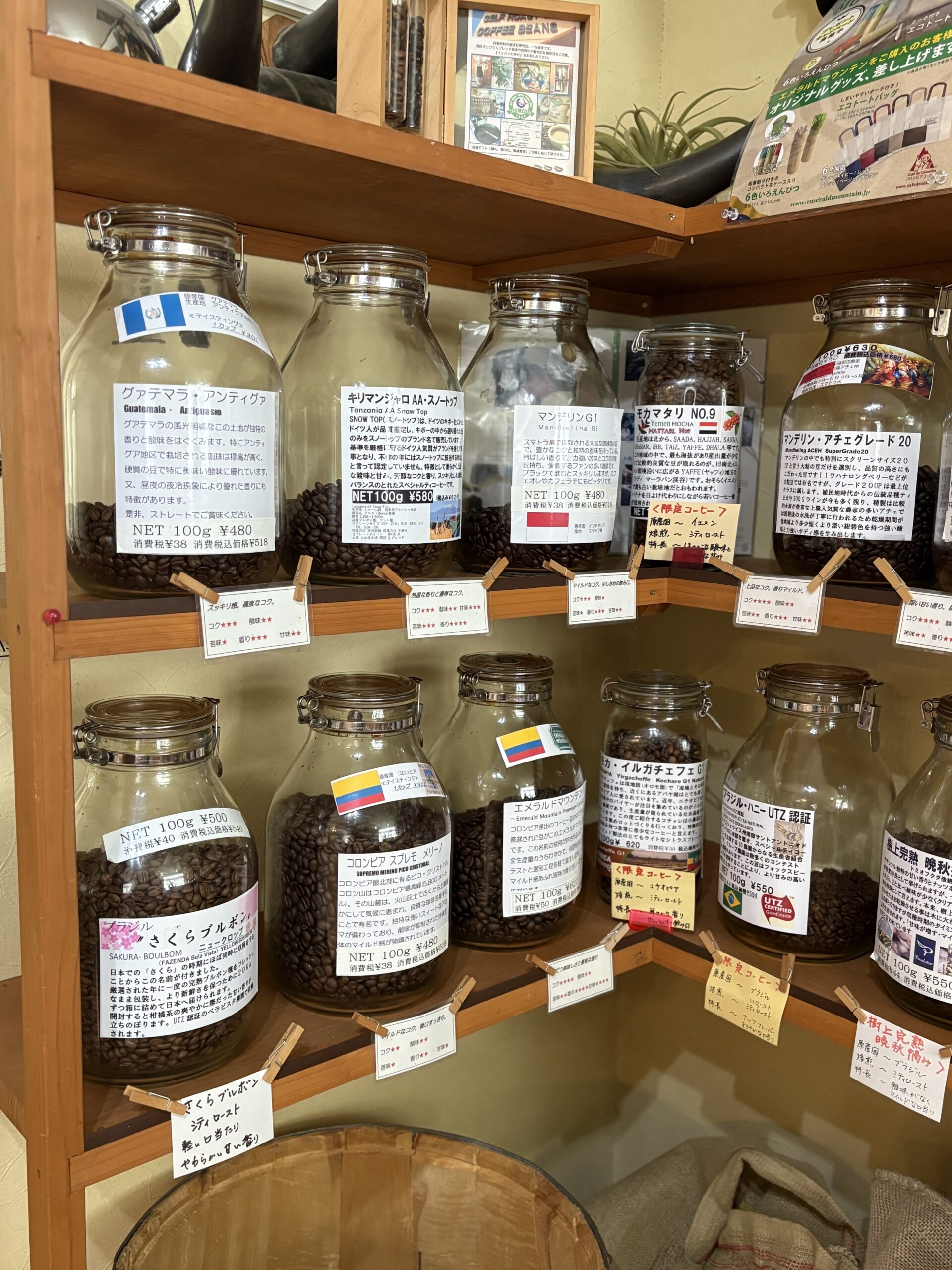 お店の中に入るとコーヒー豆が入っ瓶がたくさん並んでいます。