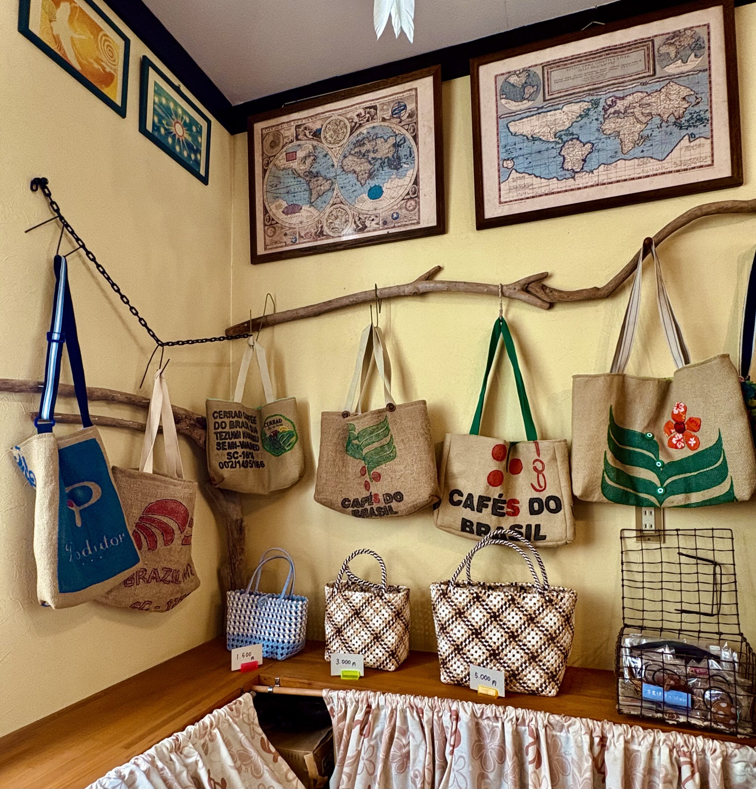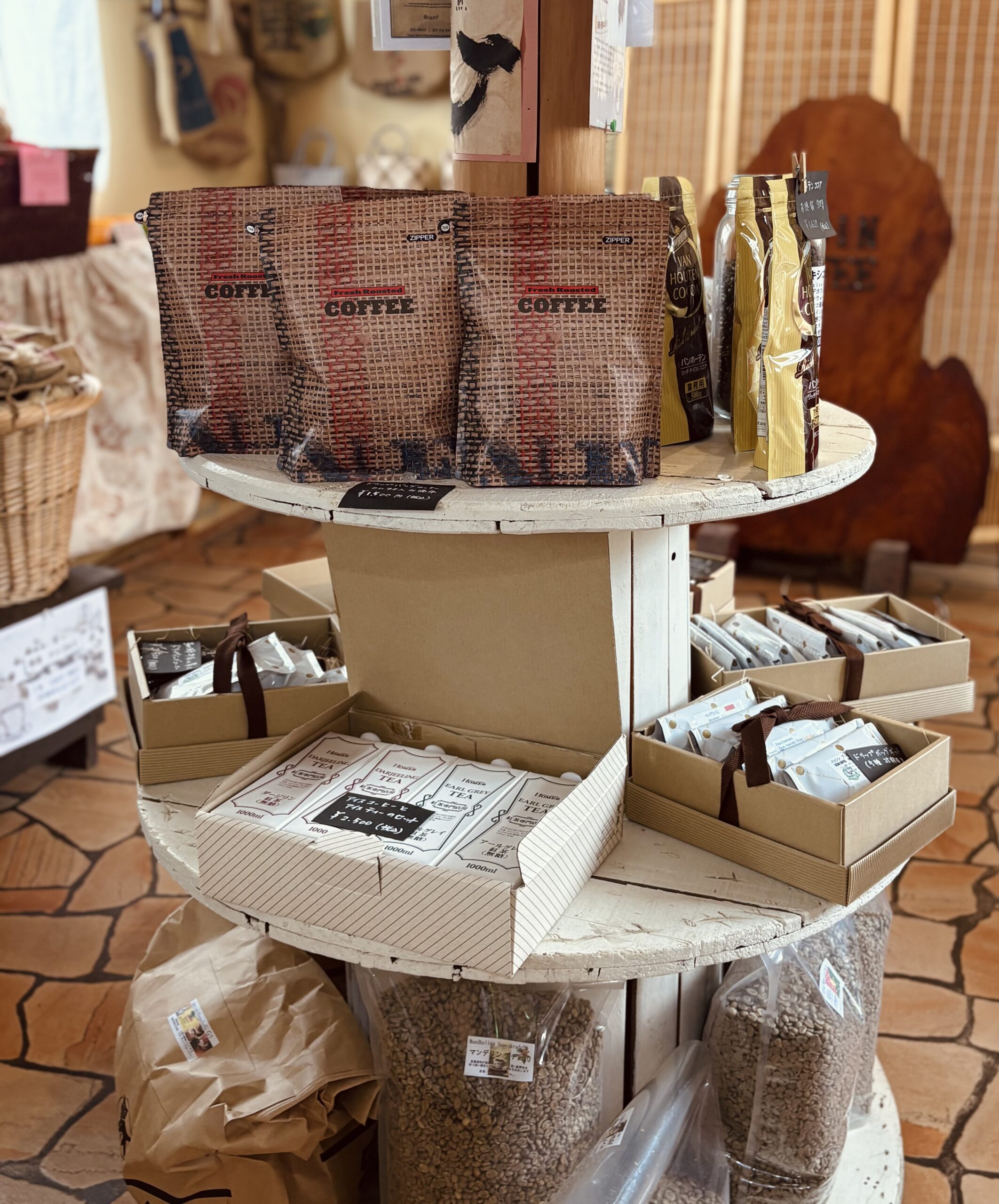 コーヒー豆が入っていた麻袋を活用したバックなども販売されていました。