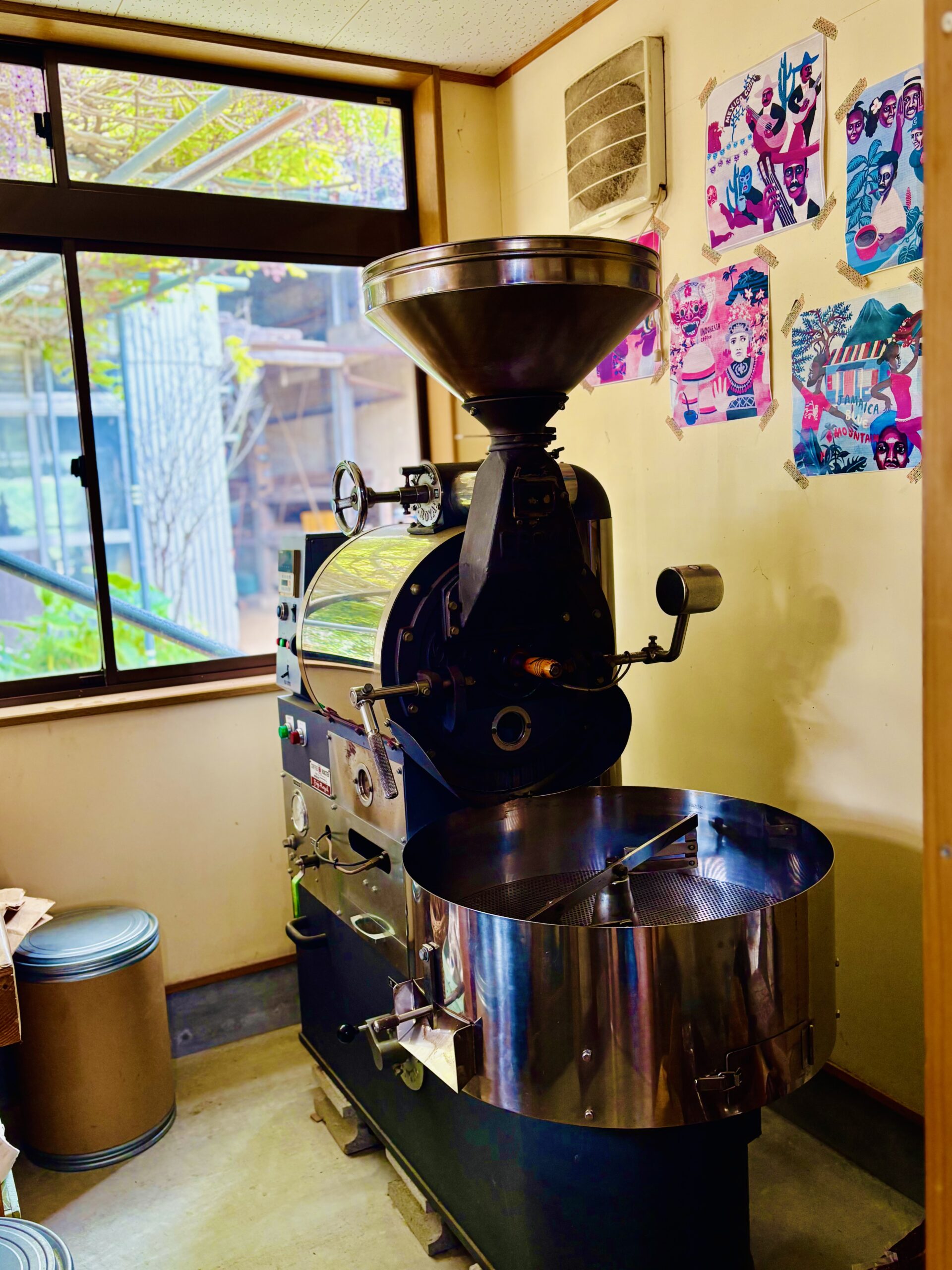瓶が並ぶ隣の部屋には焙煎機がありました。