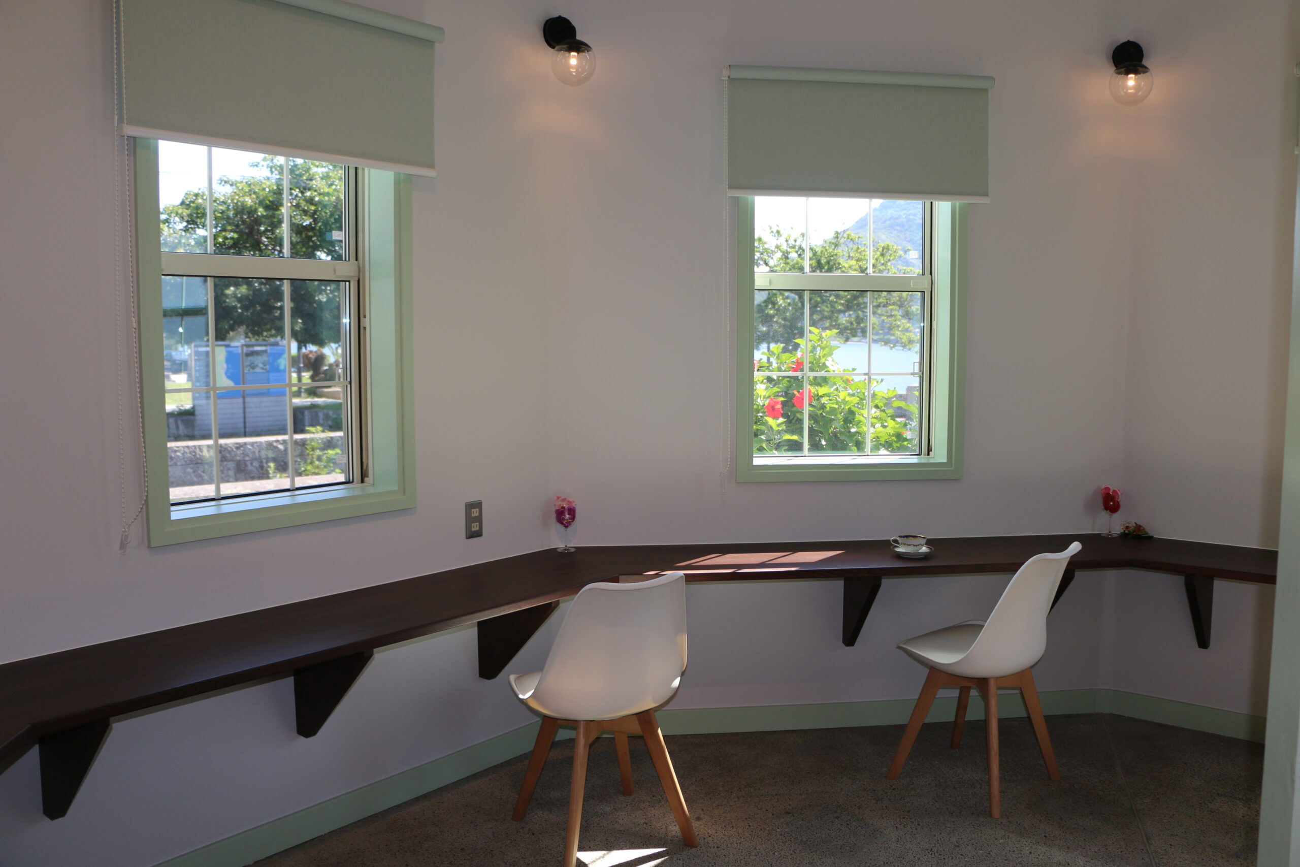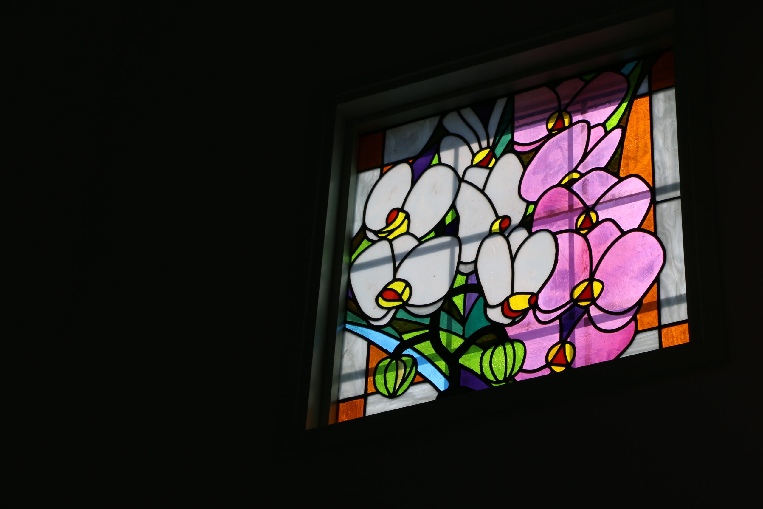 宇城市をモチーフにしたステンドグラスが輝く休憩スペースでは珈琲やアイス、軽食も楽しめます!