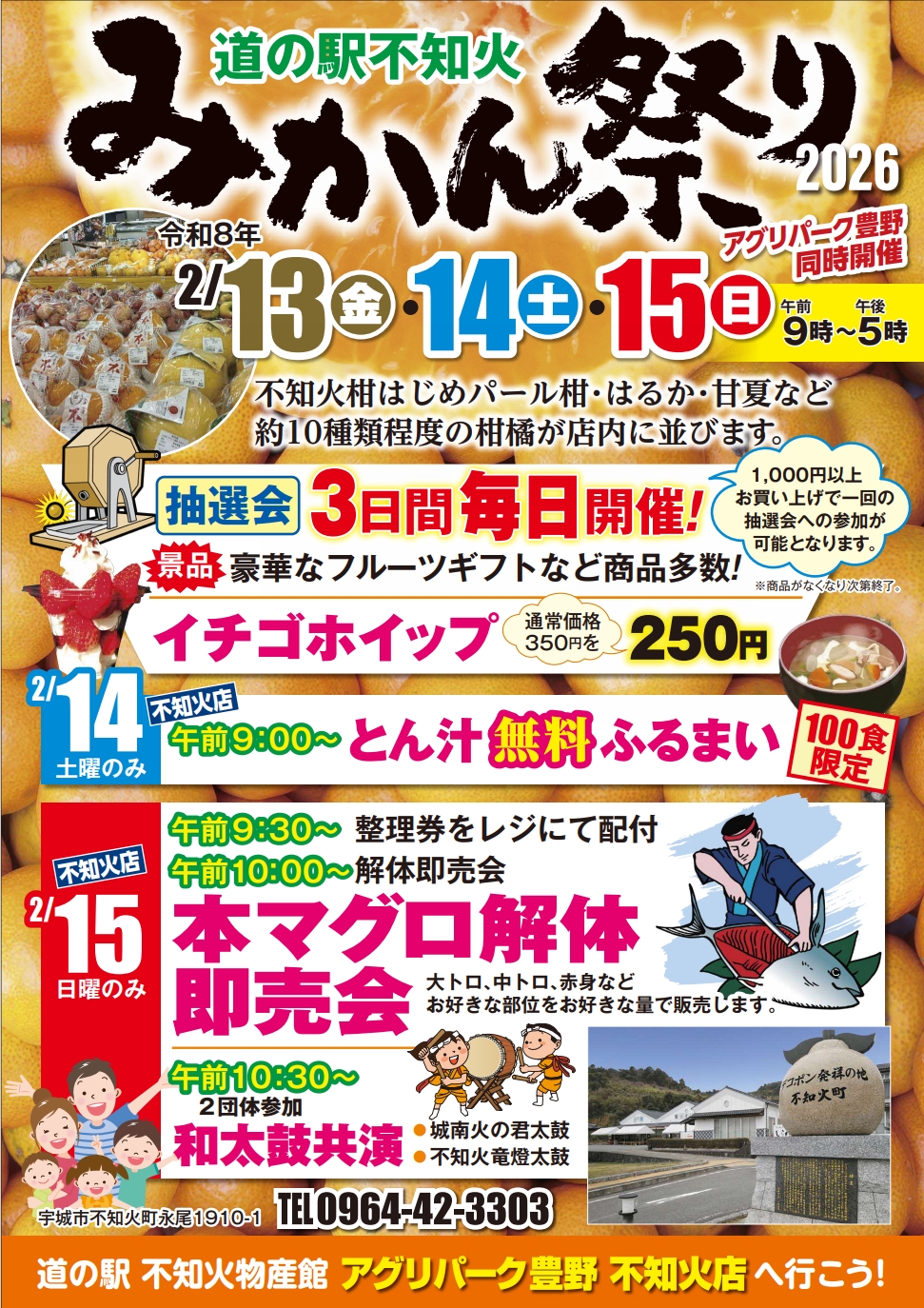 2月13日(金)・14日(土)・15日(日)、道の駅不知火の物産館「アグリパーク豊野・不知火店」にて『みかん祭り2026』が開催されます!